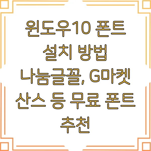디지털 세상에서 폰트는 단순한 글자 이상의 의미를 지닙니다. 콘텐츠 가독성과 심미성은 물론, 브랜드 아이덴티티까지 좌우하는 핵심 요소죠! 윈도우 10 기본 폰트만으로는 디자인의 한계를 느끼셨다면? 지금부터 폰트 설치 방법과 함께 나눔글꼴, G마켓 산스, 티몬체 등 매력적인 무료 폰트들을 소개합니다. 디자인 혁신을 위한 여정, 지금 시작해보세요!
