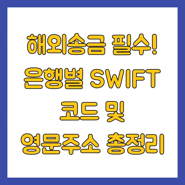해외송금, 이젠 선택 아닌 필수죠?! 유학, 해외 투자, 이커머스 등 글로벌 활동이 늘면서 해외송금의 중요성도 껑충 뛰었어요. 하지만 송금 절차, 생각보다 까다롭습니다. 잘못된 정보 입력은 송금 지연, 수수료 발생 등 으악! 생각만 해도 골치 아픈 문제들을 일으키죠. 핵심은 SWIFT 코드 와 은행 영문주소 ! 이것만 제대로 알면 해외송금, 문제없습니다! 이 포스팅에서 국내 주요 은행 정보를 깔끔하게 정리해 드릴게요!