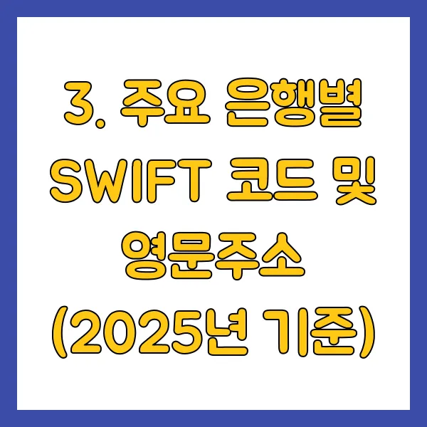 3. 주요 은행별 SWIFT 코드 및 영문주소 (2025년 기준)